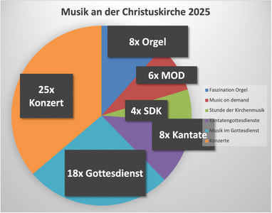 25 Konzerte, 8 Orgelkonzerte in der Reihe Faszination Orgel, 8 Kantatengottesdienste, 6 Konzerte in der Reihe Music on demand und 4 Stunden der Kirchenmusik wurden so in der Christuskirche durchgeführt.