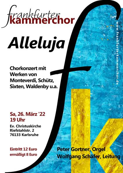 Tickets gibt es im Vorverkauf bei www.reservix.de oder bei unserem lokalen Partner Musikhaus Schlaile: https://www.reservix.de/tickets-frankfurter-kammerchor-alleluja-in-karlsruhe-christuskirche-am-26-3-2022/e1911914